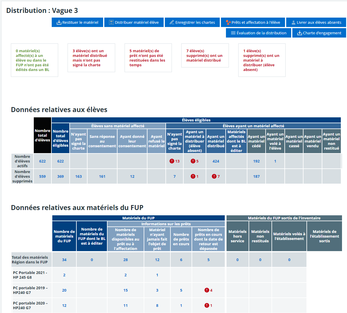 The application integrates functions to manage equipment throughout its throughout its lifetime Temporary loan, return, theft, transfer, receipts... From Dashboards enable both the Region and the Schools to monitor the progress of distribution, stock levels and required actions in real time.