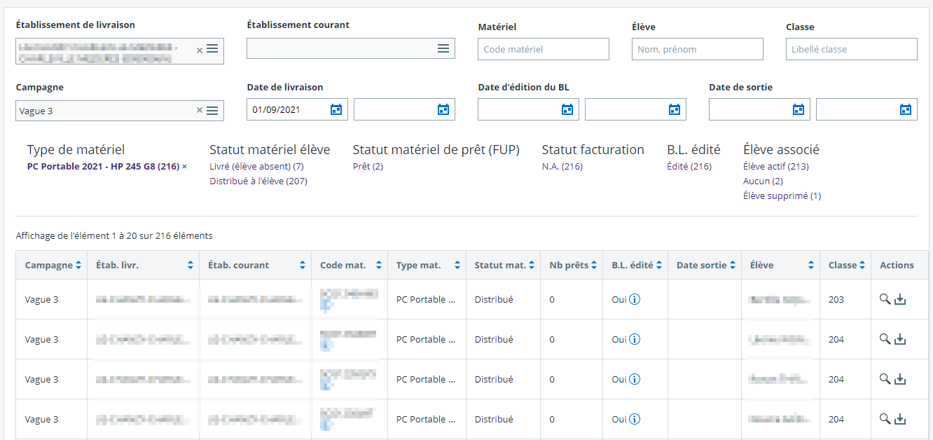 L’application intègre des fonctionnalités permettant de gérer le matériel pendant toute sa durée de vie : Prêt temporaire de dépannage, restitution, vol, cession, justificatifs... Des tableaux de bord intégrés permettent aussi bien à la Région qu’aux établissements scolaires de suivre en temps réel le bon déroulement de la distribution, l'état du stock et les actions requises.